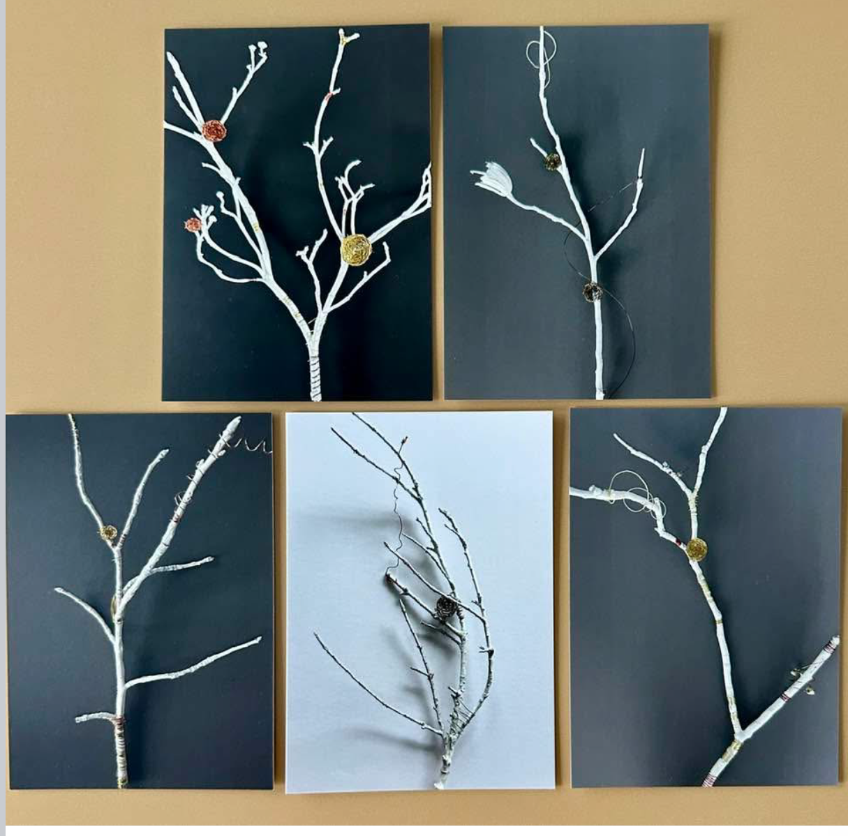 This set of 5 postcards features handcrafted copper-wire nests from the Nested Branches collection by B. Disckind. Each card captures the delicate beauty and artistry of these miniature sculptures, celebrating themes of home, nature, and gratitude.